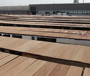 天然柚木在制造成高品质地板前,必须经由严格控制的自然光化工序——反复晾晒、洒水、晾晒、洒水……以使其油分均匀渗透、光化。