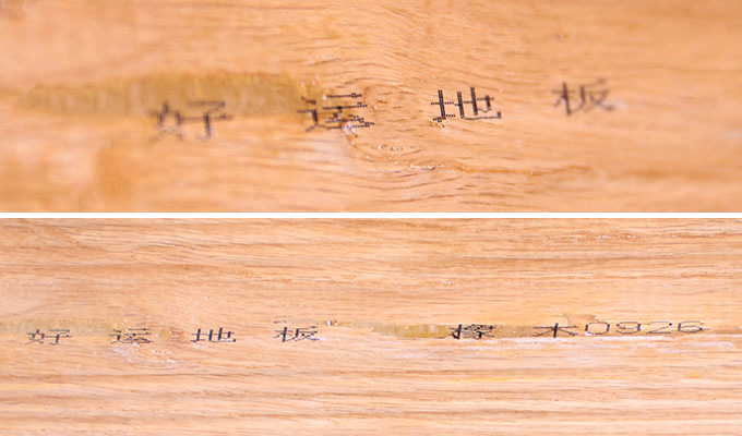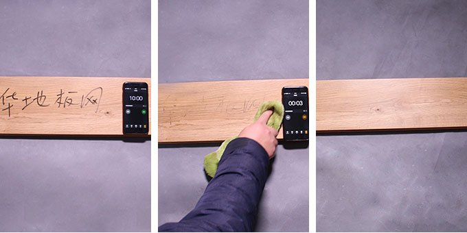 使用水性笔在地板表面写下“中华地板网”字样,静置十分钟后,用干抹布可以轻松擦掉,并没有污渍残留,地板的抗污能力强。