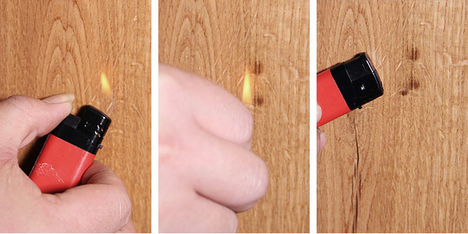 用打火机灼烧地板表面一分钟左右,表面有黑色烟熏痕迹,经擦拭痕迹未消失,这也是实木的天然属性,不过经表面工艺处理后,实木地板的耐高温性能有了一定提升。