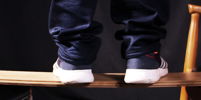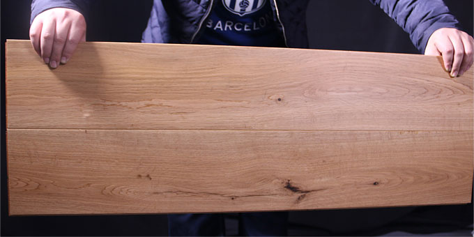 将地板架于沙发之间,邀请体重为70kg的男同事站立于地板。板材以站立点为中心,出现小弧度形变,不过在未受力后即恢复原样,这在实木地板中已经算很不错了。