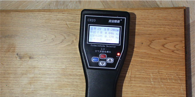将地板静置于密封空间十分钟后,甲醛检测仪检测显示地板表面空气的甲醛浓度为0.046mg/m³,完全符合并优于环保标准。