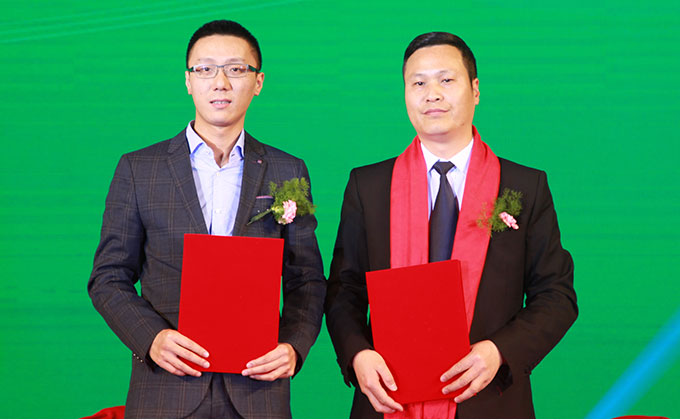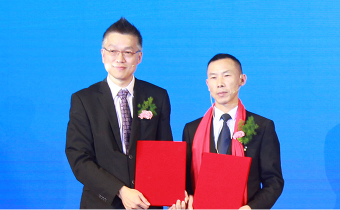 PPG工业涂料木器漆商务总监张福昌先生与柏尔地板生产总监张春华先生上台签约。