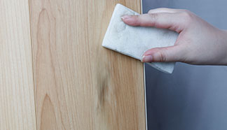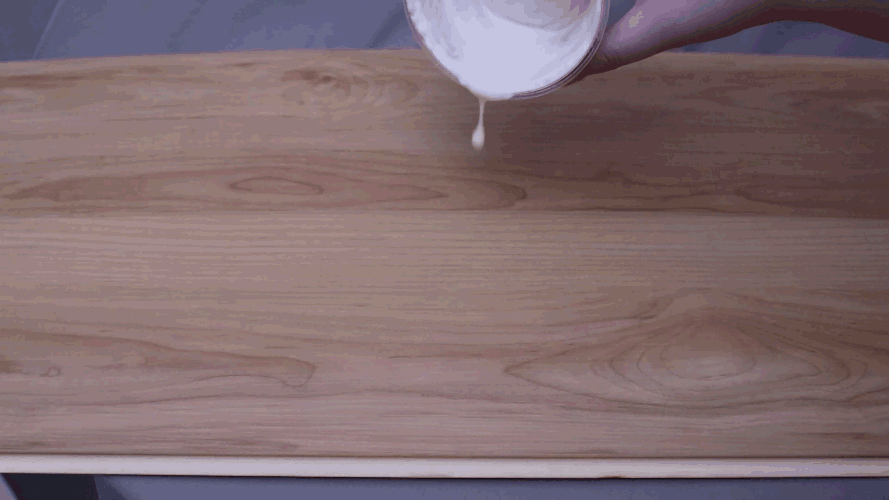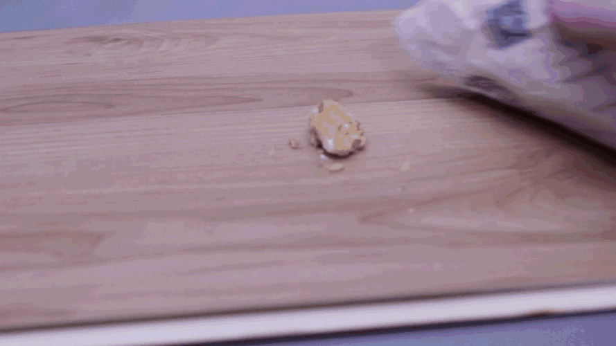 在地板拼接处倒上榴莲芝士,3分钟后用纸巾清洁地板,拼接处无任何残留。