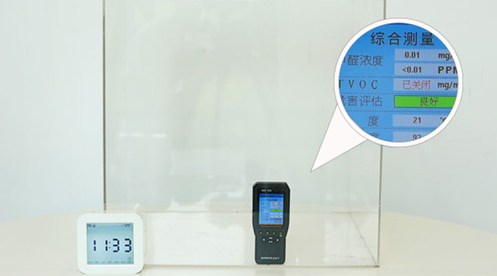 准备尺寸为40*40*40(单位:cm)的密封亚克力盒子,用甲醛测试仪检测箱内甲醛含量,一小时内甲醛含量数值维持在0.01mg/m³。