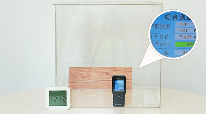 切割出0.65x25x15.5cm的超级地板样品放入盒内,约30分钟后,测得箱内的甲醛含量为0.01mg/m³,说明30分钟内超级地板样品甲醛释放量未检出。