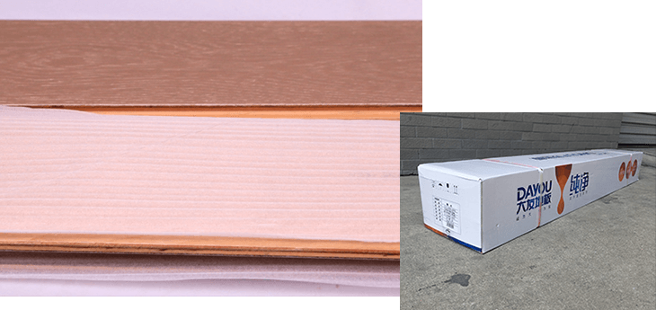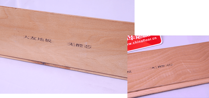 木板背面“大友地板,无醛芯”标识,清楚表示品牌名字及基材信息。