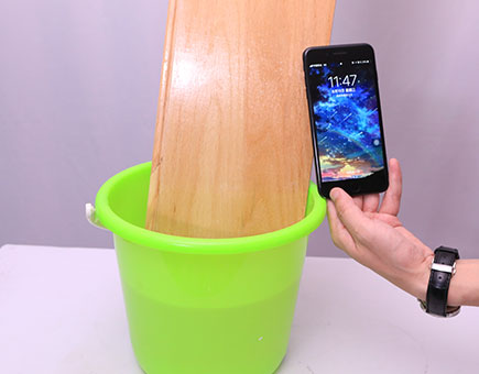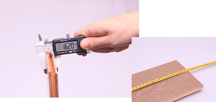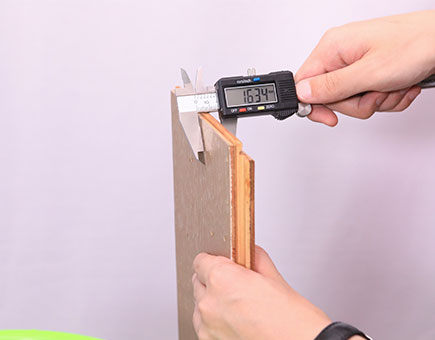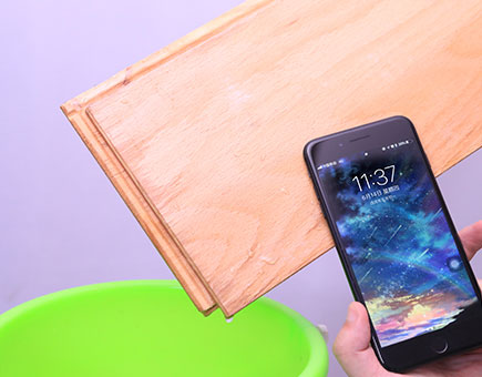 为了检测这款地板防潮性能,对地板进行了水泡实验,实验开始前,先记录木板的厚度为15mm,将地板浸泡咋水中,24小时候,将地板取出,测量出厚度为约为16.1mm,计算得出吸水厚度膨胀率约为7%,明显低于国标的18%,这款地板采用360度全面封蜡,双重防潮工艺效果极佳。