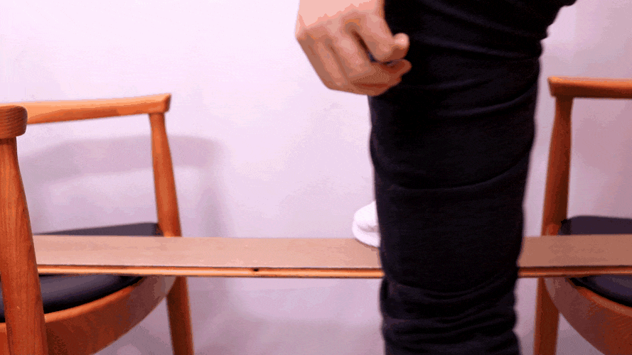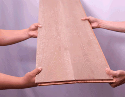 这款大友地板采用新西兰辐射松为基材,稳定性极佳,为了测试地板的承重力,安排体重约为65KG的人员,站在中间悬空的地板上,地板出现小弧度弯曲,但无断裂现象,受力后随即恢复原状,承重效果优异。