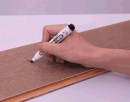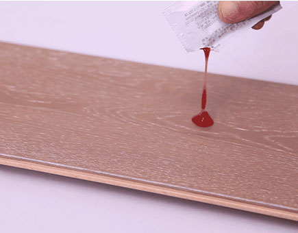 大友这款地板表面采用仿古拉丝工艺,由于工艺的特性,其实没有必要做此项测试,但为了全方位呈现这款地板性能,我们以日常生活中常见的水性笔、酱油、番茄酱进行了测试。