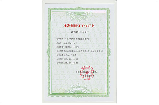 《地采暖用实木地板技术要求》标准制修订工作证书