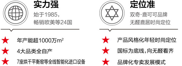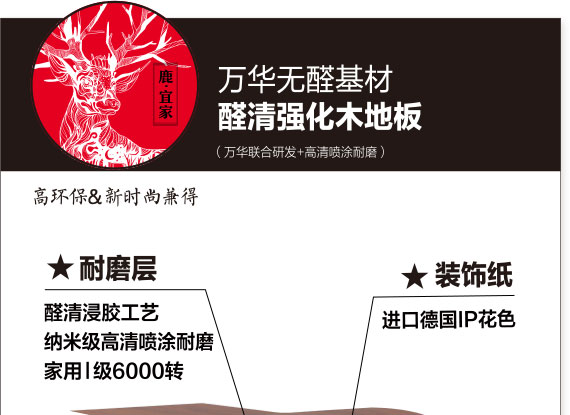 鹿可可醛清强化木地板采用国际喷涂耐磨工艺,不仅完美体现花色的精致度,更是能达到家用I级的耐磨度,经国家权威检测甲醛含量只有0.016mg/m3,比新国标E1远低87%,远优于F4星,如此硬实力数据,行业仰望。